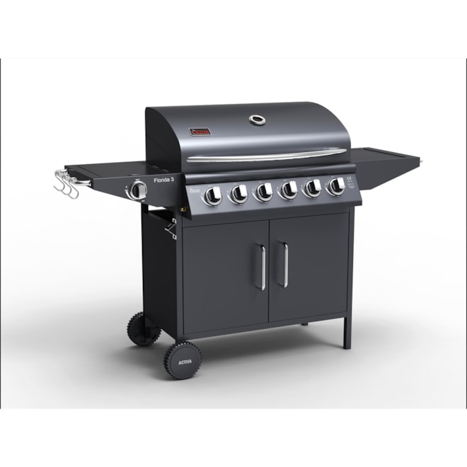 Velký plynový gril se šesti hořáky za skvělou cenu – to je model Florida III od německé společnosti Activa. Skvěle se hodí pro chutnou a rychlou přípravu jídel pro společnost až 12 lidí. Základem vysokého výkonu je šest moderních výkonných plochých hořáků s horním krytem, díky kterému je odkapávající tuk veden mimo plamen a odveden do speciální nádržky. Pokrm tak bude vždy zdravý bez zbytečných škodlivých prvků, které vznikají přepalováním tuku. Gril má rovněž praktický integrovaný boční vařič vhodný na přípravu omáček, horkých nápojů nebo příloh. Hořáky se pohodlně zapalují pomocí piezo zapalování integrovaného v otočných knoflících. Gril je dále vybaven kvalitním dvoudílným smaltovaným litinovým grilovacím roštem kombinovaným s litinovou ohřívací deskou a dalším vyklápěcím roštem, který je vhodný na nepřímé grilování masa či zeleniny anebo na ohřívání již ugrilovaných pokrmů. Gril má kvalitně lakované víko s velkým nerezovým madlem a zabudovaným teploměrem, dvě odkládací poličky na každé straně s madly vhodnými na pověšení grilovacího náčiní a praktický odkládací prostor pod grilem, který je přístupný dvířky zepředu. Pro snadný transport je vybaven kolečky. Na rozdíl od mnoha jiných grilů je již v základu vybaven vším potřebným pro připojení k plynové lahvi 5 nebo 10 kg. Gril je vybaven integrovanýmdržákem plynové bomby.