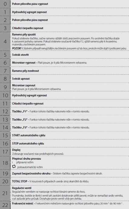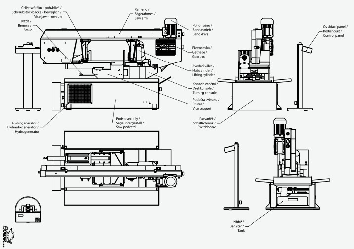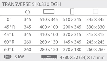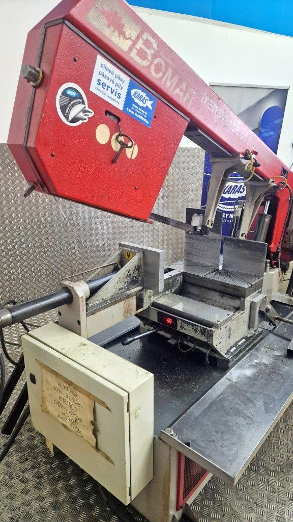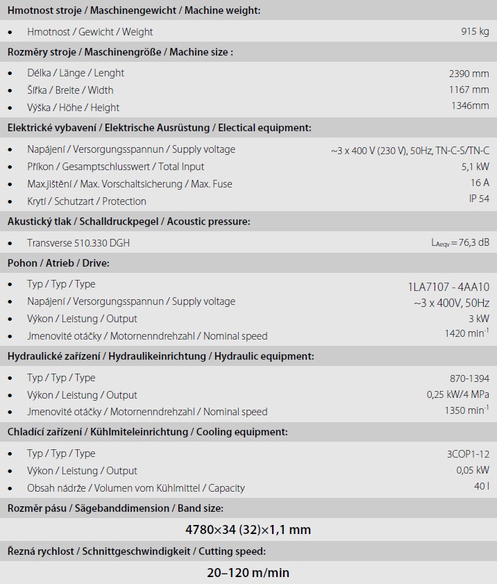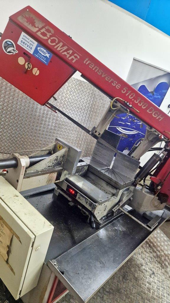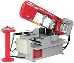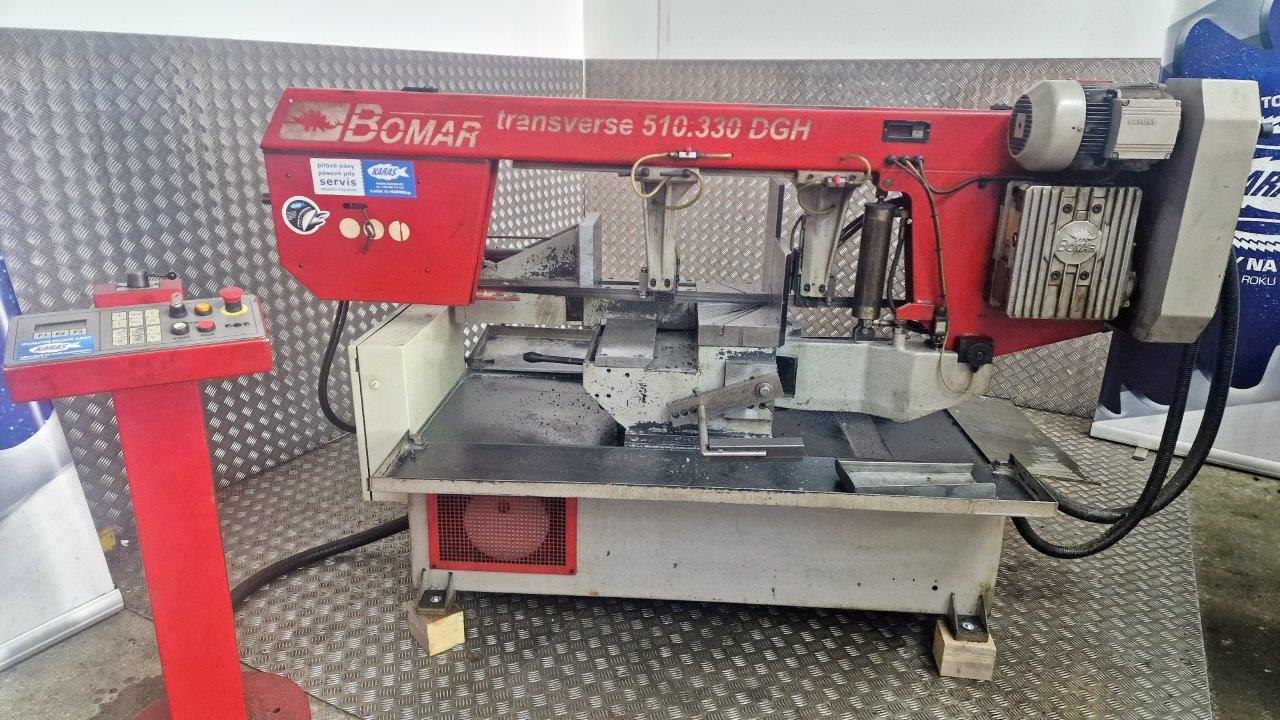 BOMAR TRANSVERSE 510.330 DGH - je hydraulická poloautomatická pásová pila s možností oboustranného natáčení ramene pily. Úhlové řezy jsou u tohoto typu v rozsahu od -60° do +60°. Natáčení ramene pily je manuální s digitálním snímáním a zobrazováním nastavovaných úhlů řezu na displeji. Nastavování úhlových řezů se provádí velmi jednoduše přímo z místa obsluhy pily. Stroj je sériově vybaven frekvenčním měničem, umožňující nastavení optimální rychlost pilového pásu dle druhu řezaného materiálu v rozsahu 22 - 90 m/min. Do pily se používá pilový pásy o rozměrech 4780x34x1,1 mm. Posuv materiálu do řezu je manuální. Pilu lze jednoduše ovládat z přemístitelného ovládacího panelu, viz. obr. stroje. Pásová pila na kov Bomar Transverse 510.330 DGH disponuje přesným tvrdokovovým vedením pilového pásu, automatickou regulaci přítlaku do řezu, digitálním ukazatelem úhlu řezu, digitálním ukazatelem rychlosti pásu, poháněným kartáčem na odstraňování pilin, volně umístitelným ovládacím pultem, hydraulický, plnozdvihový, svěrákem, elektronickou kontrolou napnutí pilového pásu, nastavením výšky ramene pomocí funkce Memory z ovládacího pultu, velkým poháněcím a převáděcím kolem pro maximální životnost pilového pásu, výkonným hydraulickým agregátem a moderním řízením s jednoduchým ovládáním a textovou diagnostikou stroje na osvětleném displeji. Pozn.: K pásové pile TRANSVERSE 510.330 DGH je možno z levé (přívod materiálu) i pravé strany (odvod materiálu) připojit poháněné XP 550 nebo nepoháněné X 550 válečkové dopravníky s nosností 1200 kg/m. Požadovanou délku dopravníku lze sestavit z jednotlivých modulů v délkách 2 nebo 3 m. Počet podpěrných noh se stanoví na základě celkové délky dopravníku.