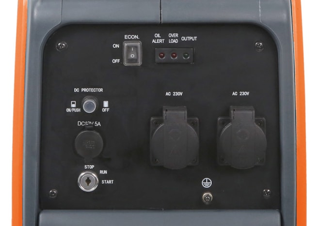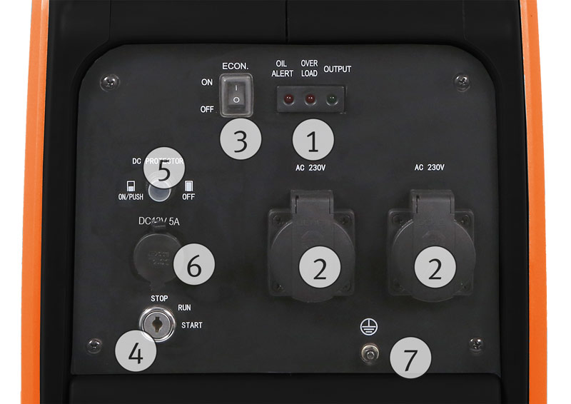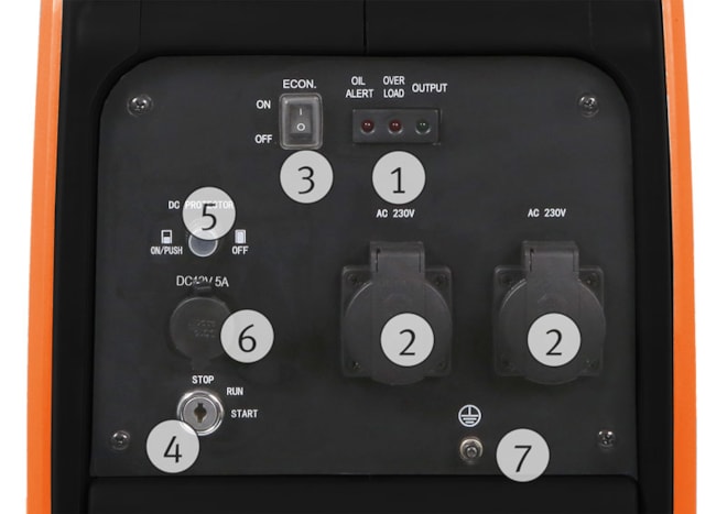 - Kontrolky výstupního napětí, přetížení a nedostatku oleje