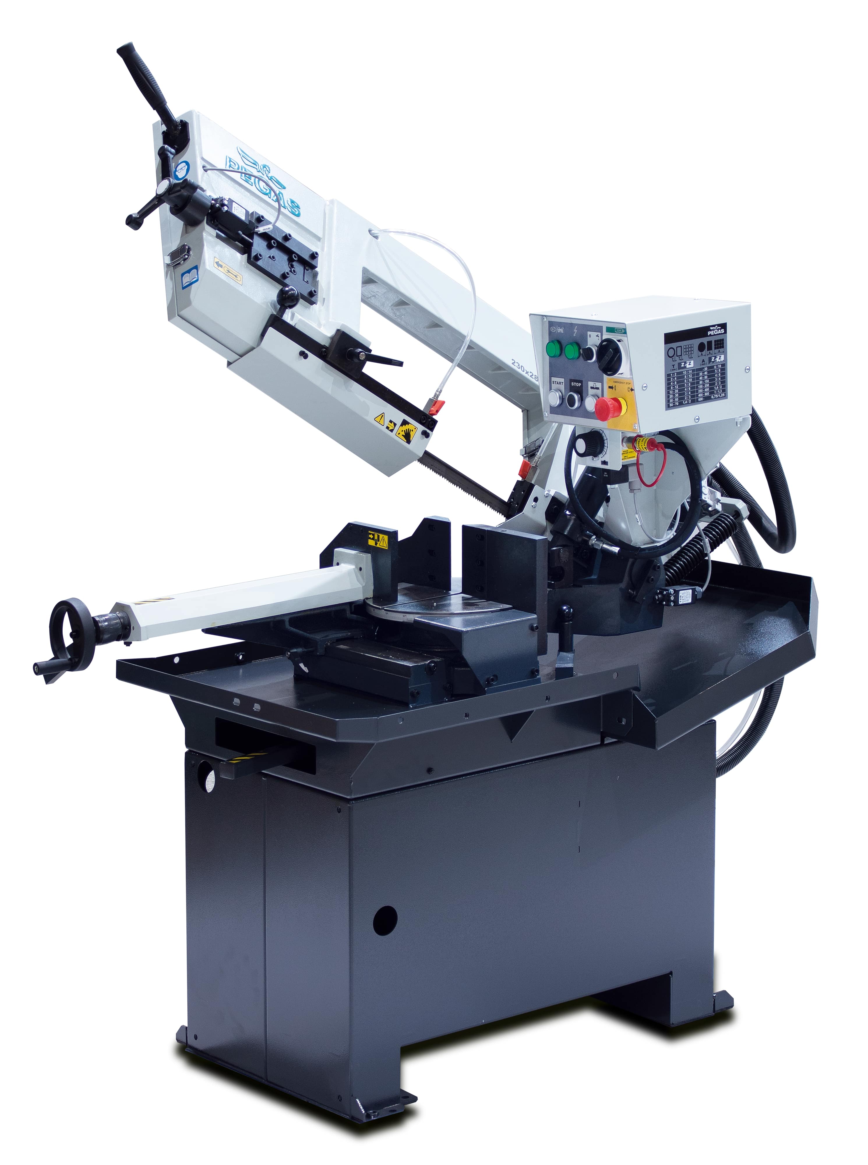 Pracovní pohyb ramene zajištěn vlastní hmotnosti ramene, pozice ramene je definována hydraulickým válcem. Škrtící ventil pro regulaci rychlosti řezného posuvu. Po dokončení řezu v dolní poloze se pohyb pilového pásu automaticky vypne. Zdvihnutí ramene provádí obsluha manuálně. Manuální upnutí a uvolnění materiálu. Obsluha manuálně zakládá, posouvá a odebírá materiál