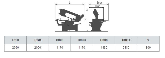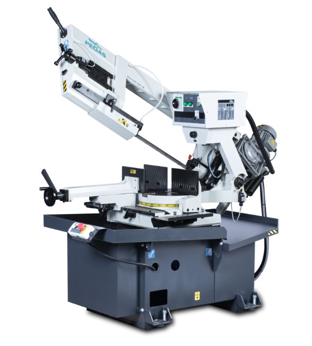 Pracovní pohyb ramene zajištěn vlastní hmotnosti ramene, pozice ramene je definována hydraulickým válcem. Škrtící ventil pro regulaci rychlosti řezného posuvu. Po dokončení řezu v dolní poloze se pohyb pilového pásu automaticky vypne. Zdvihnutí ramene provádí obsluha manuálně. Manuální upnutí a uvolnění materiálu. Obsluha manuálně zakládá, posouvá a odebírá materiál.