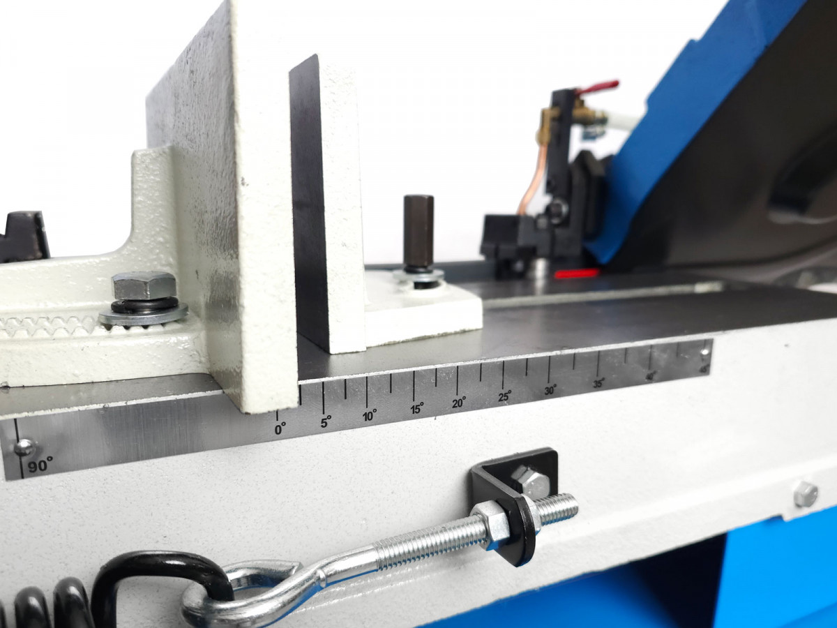 Mobilní pásová pily PMS 180/300 MO-BIL nemá standardní vytáčení ramene do úhlu, protože má snížené těžiště a větší rozsah kapacity řezané šířky materiálu. Na tomto typu pily se vytáčí pouze čelisti svěráku i s řezaným materiálem. Čelisti svěráku lze vytočit na levou stranu až do úhlu 45°, kde lze řezat materiál maximálně do O 110 mm a šířky 180 mm.