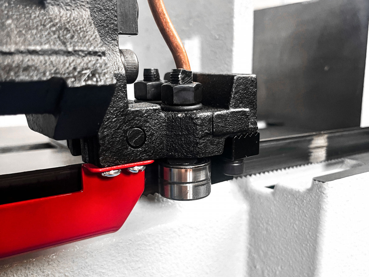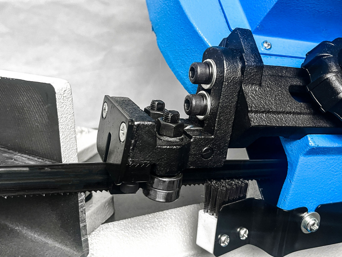 Vodící kostky pro pilový pás jsou ze slinutého karbidu pro co nejvyšší otěruvzdornost a tepelnou odolnost. V karbidech jsou vybroušeny drážky, které slouží pro lepší rozvod chladicí kapaliny mezi vodítky a pilovým pásem. S karbidovými vodítky pilového pásu lze jednoduše manipulovat pro nastavení co ideální mezery. Pilový pás má šířku 20 mm.
