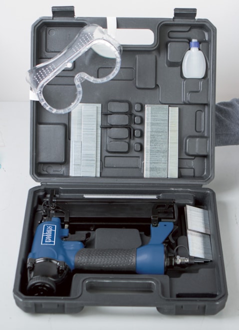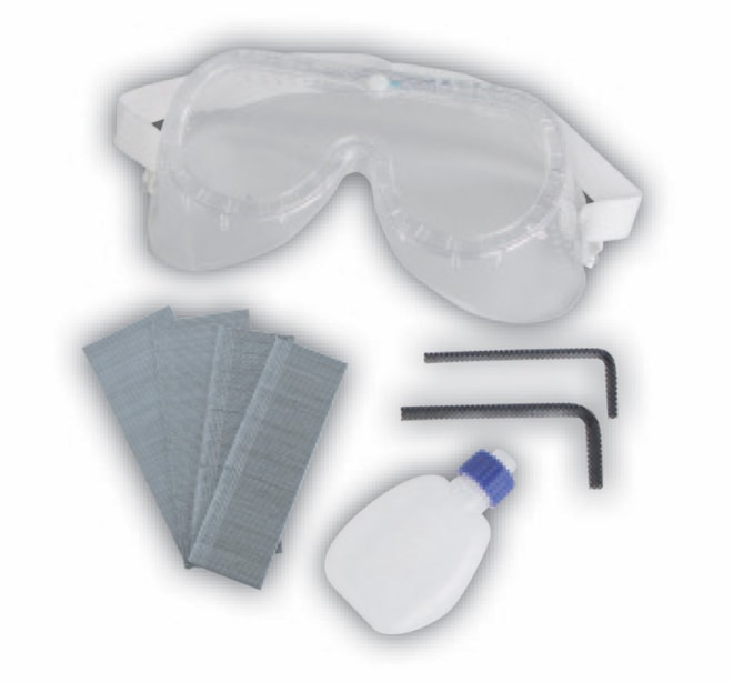 příslušenství: 1000 ks hřebíků, 1000 ks spon, 2 x imbusový klíč, maznička, olej, ochranné brýle