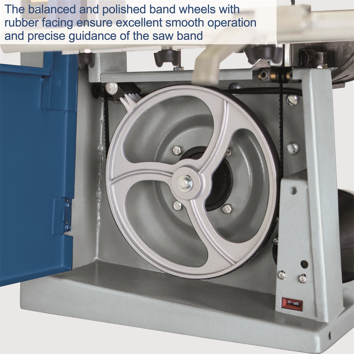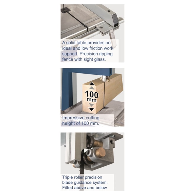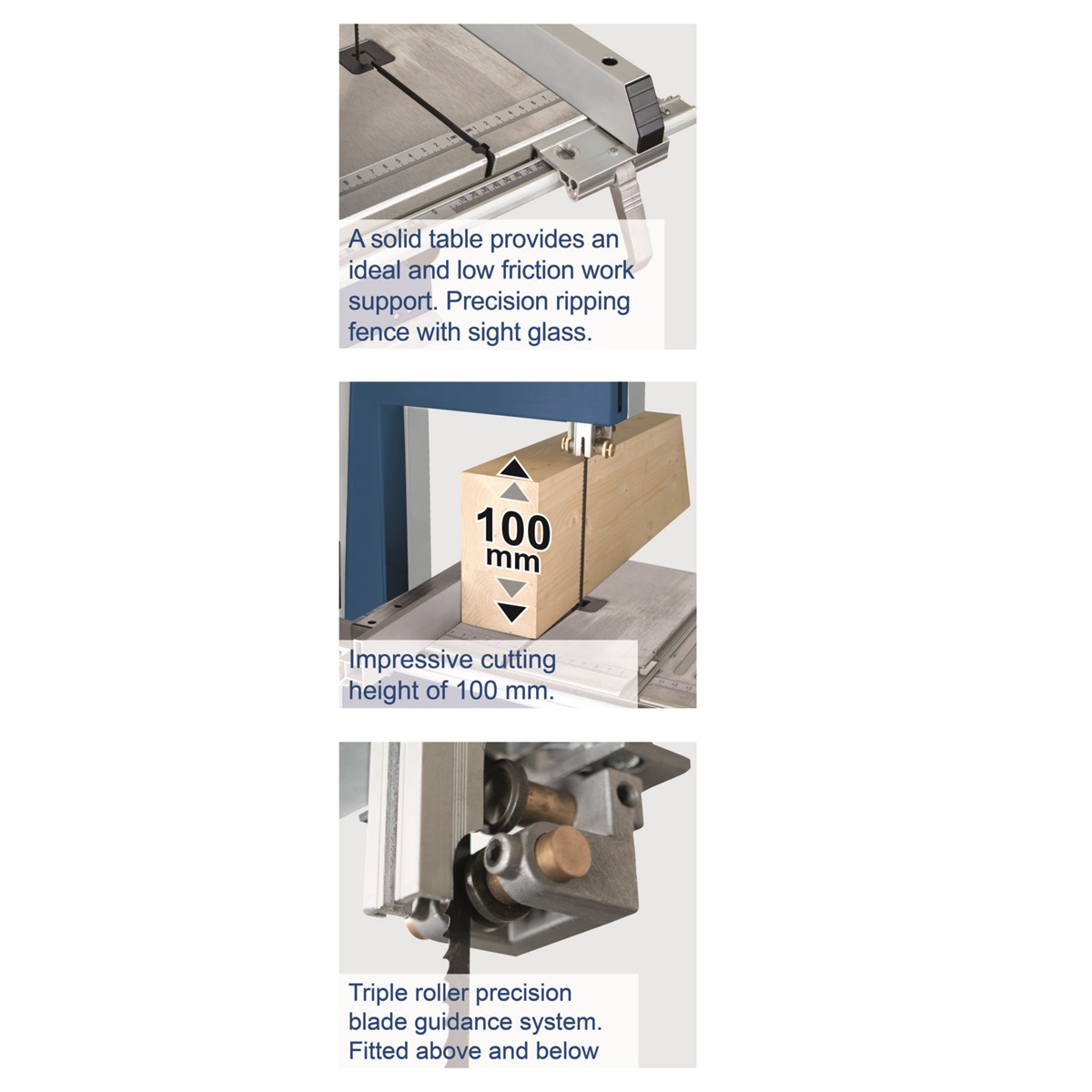 Pila je vybavena velmi přesným vedením pilového pásu na třech válečkách, a to jak nad, tak i pod stolem. Pilový pás je veden po velkém, speciálně centrovaném kole s gumovým povrchem, což zajišťuje mimořádně stabilní chod. Horní vedení pásu je výškově nastavitelné, takže lze snadno přizpůsobit práci různým obrobkům.