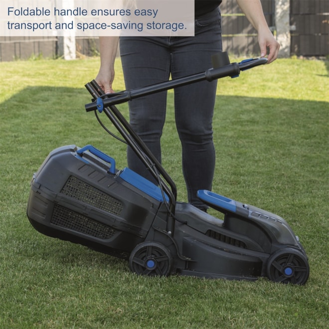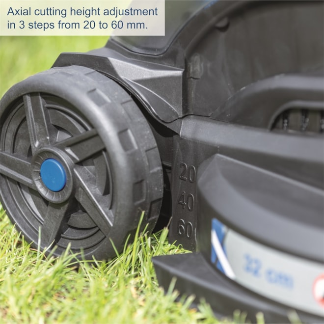 Sekačka je ideální pro menší zahrady o velikosti do 250–300 m2. Nastavení výšky střihu je snadné díky třístupňovému systému s rozsahem od 20 do 60 mm. Sběrný koš s kapacitou 30 litrů a indikátorem naplnění vám usnadní práci. Sekačka je vybavena bezpečnostním klíčem a sklopným krytem chránícím baterii. Vysoce odolný nůž ze speciální oceli zaručuje dlouhou životnost. Sklopné madlo umožňuje snadné a prostorově úsporné skladování. Stroj se dodává bez baterie a nabíječky.