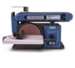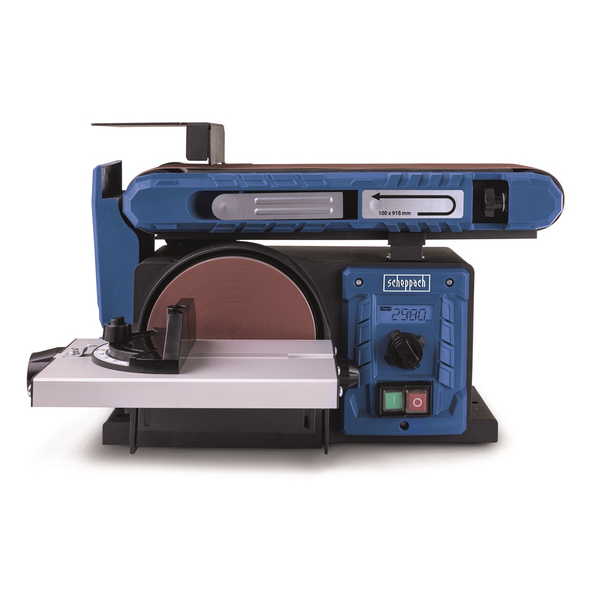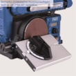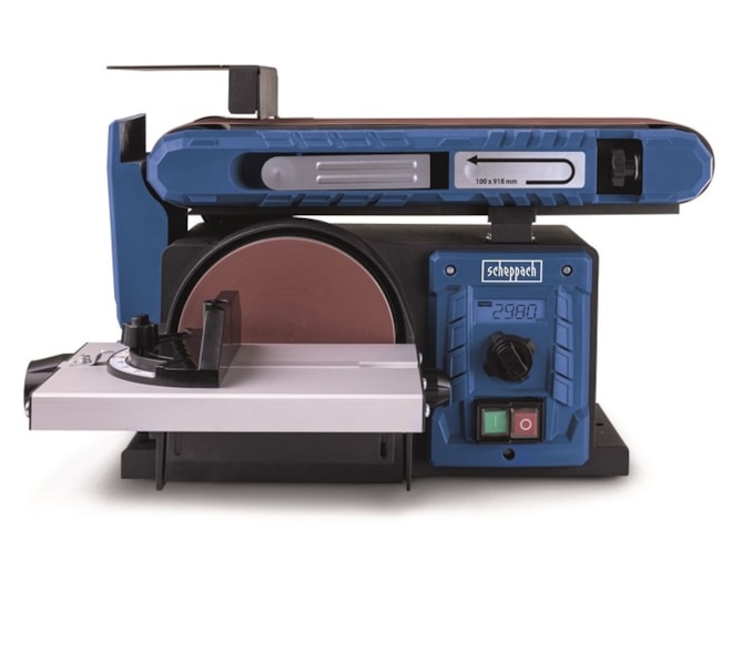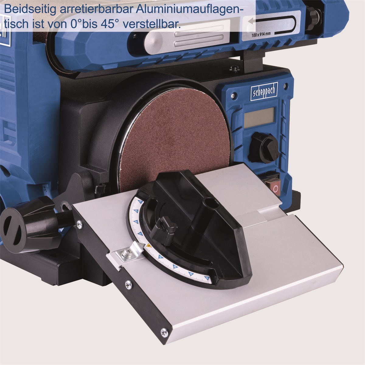 Stroj nabízí vysokou variabilitu – jednotku s brusným pásem lze naklápět v rozsahu 0–90°, tedy od horizontální do vertikální polohy. Přídavný pracovní stolek s úhlovým pravítkem je sklopný a lze jej zajistit mezi 0° a 45°. Na rozdíl od mnoha konkurenčních modelů je kotoučová bruska plně integrována do těla stroje, takže neomezuje prostor pro práci ani s většími obrobky. Brusný papír se na kotouč upevňuje snadno pomocí suchého zipu.