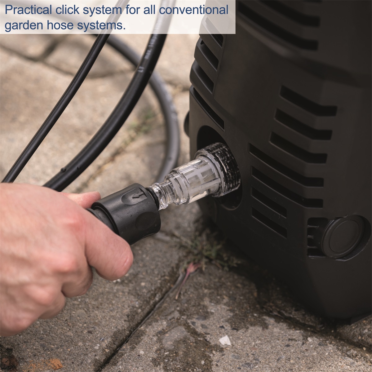 Výbava: 3 m tlaková hadice, tlaková pistole s tryskou a prodlužovacím nástavcem, vstupní filtr.