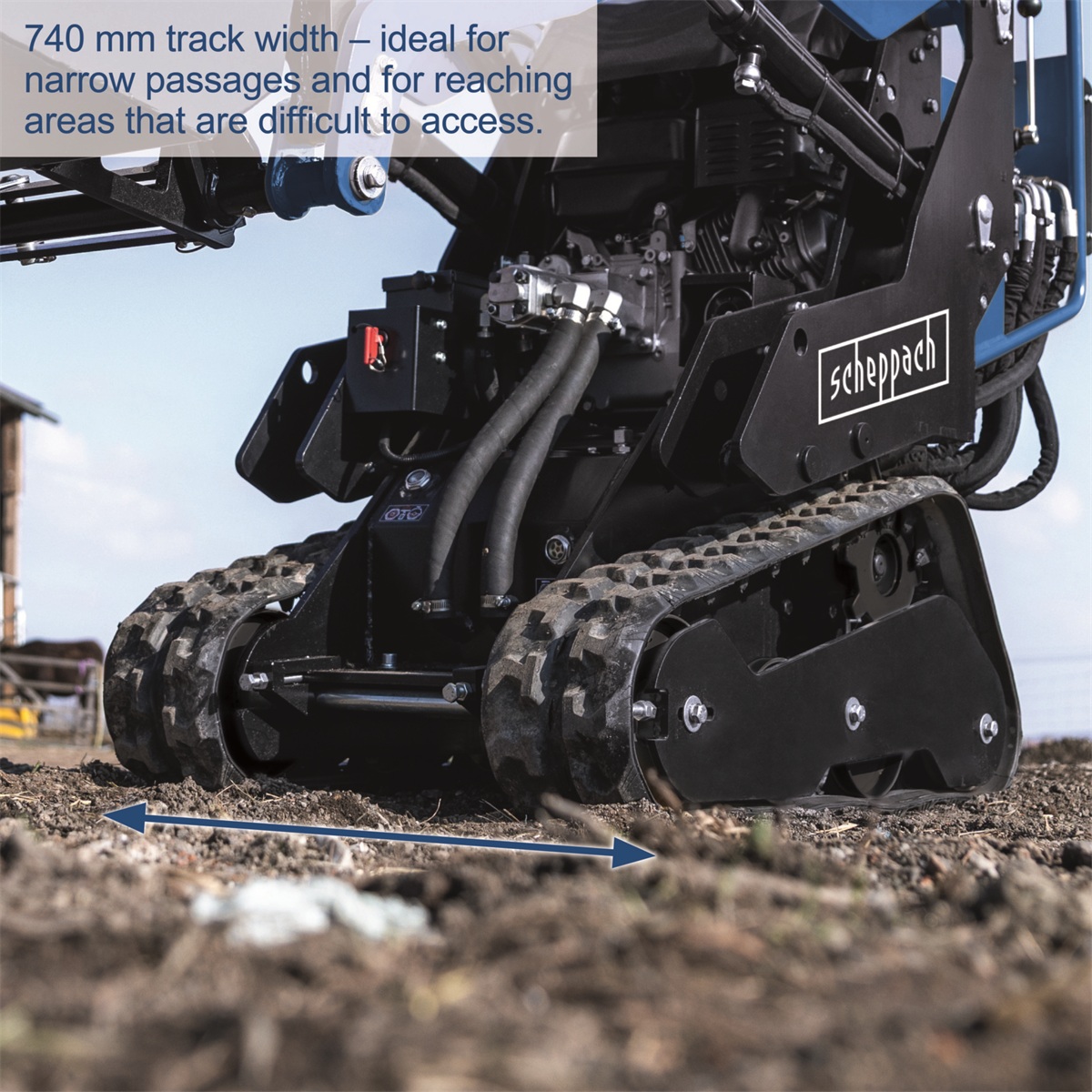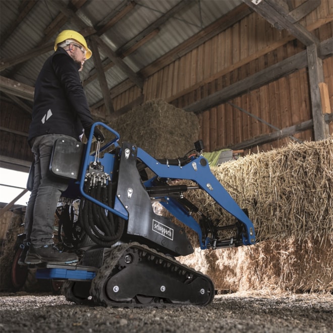 S šířkou pouhých 740 mm se snadno dostane i do úzkých průchodů a hůře přístupných míst, kde by jiné stroje selhaly. Díky výkonnému čtyřtaktnímu benzínovému motoru o výkonu 8,5 HP (306 cm3) zvládá i náročnější práci s lehkostí a spolehlivostí. Pásový podvozek s možností samostatného ovládání každého pásu a šířkou 180 mm zajišťuje maximální stabilitu i v nerovném terénu. Nakladač si poradí se stoupáním až 25° a díky nízkému tlaku na podklad (32 kPa) se pohybuje šetrně i po měkkém povrchu. Obsluha je jednoduchá a bezpečná – ergonomická plošina s bezpečnostním spínačem a boční zábranou poskytuje komfort i ochranu při práci. Nakladač je vybaven hydraulickým rychloupínáním, takže výměna nástavců je otázkou okamžiku.