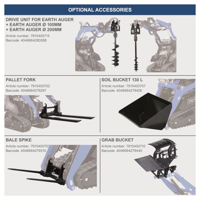V základní výbavě najdete lžíci o objemu 80 litrů, která je ideální pro každodenní použití. O dobrou viditelnost ve zhoršených světelných podmínkách se stará výkonné LED osvětlení. Kombinace maximální výšky zdvihu 2 500 mm a pojezdové rychlosti až 2,3 km/h vpřed i vzad zaručuje efektivní přemisťování materiálu. Navíc je k dispozici široká nabídka příslušenství, která rozšiřuje možnosti využití stroje a dělá z něj univerzálního partnera pro každodenní práci.