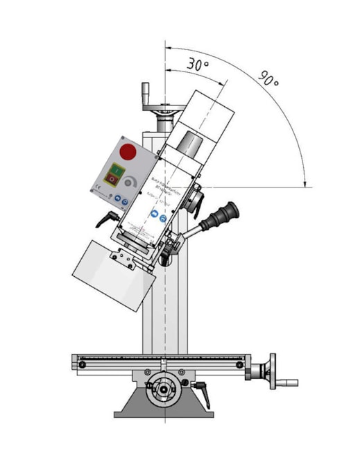 - Frézovací hlava sklopná o ±90° umožňuje frézování a vrtání pod různým úhlem